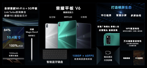 从整体来看,荣耀平板V6的特别之处在于独特的设计思路和硬核配置。作为荣耀2020年推出的旗舰级平板新品,荣耀平板V6搭载了麒麟985旗舰级芯片与自研Wi-Fi 6+芯片,支持160MHz超大频宽和动态窄频宽技术,在数据传输上实现了更快、更强的技术突破。同时,荣耀平板V6采用了10.4英寸2K全面屏,通过德国莱茵低蓝光认证和国家眼科工程中心的护眼认证,配合自研Histen6.1 3D立体音效技术,为用户打造了更高品质的视听盛宴。
