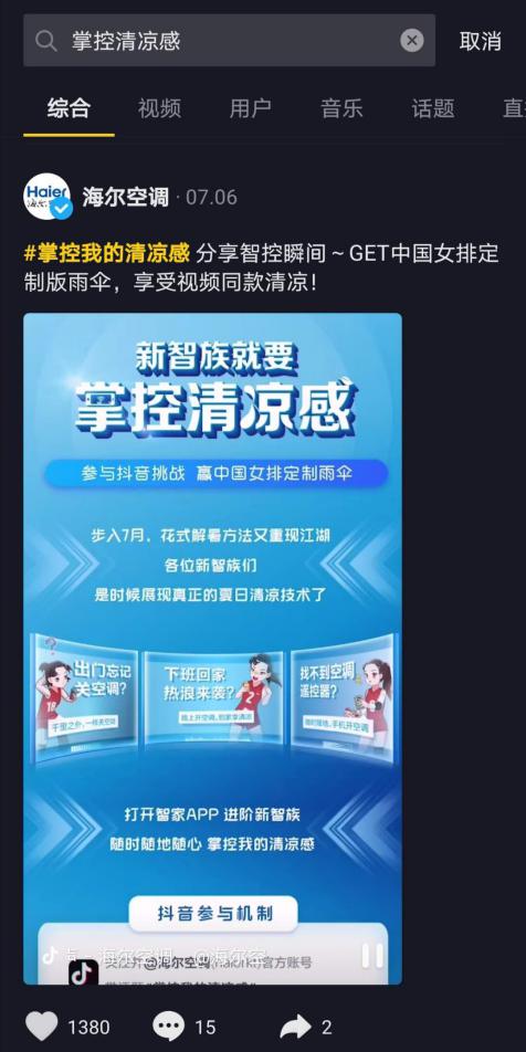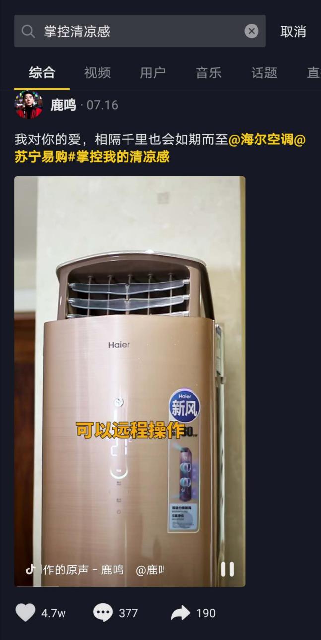 截至7月底,#掌控我的清凉感#活动总曝光量达到458.4万,累计超过2500位用户参与讨论。在抖音APP上,#掌控我的清凉感#话题引发大量讨论和原创视频的诞生。抖音网友@鹿鸣晒出了自己的经历,上班路上想起忘关空调,打开海尔智家APP,远程即可关闭。该条抖音视频获赞4.7万,不少人留言自己也有相同经历,也有网友表示要下单海尔智能空调。