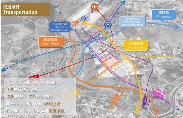 武汉是特大省会城市、中部地区中心城市,作为中国经济地理中心,素有“九省通衢”之称,是中国内陆最大的水陆空交通枢纽和长江中游航运中心,高铁网辐射大半个中国,是华中地区唯一可直航全球五大洲的城市。《武汉市城市总体规划(2017-2035年)》提出,大力主推会展业发展,全力打造国际会展之都,明确提出建设百万方新会展中心。武汉绿地天河国际会展城位于依托武汉天河机场发展的武汉黄陂临空经济区核心,距离天河机场仅5公里,轨道交通密集,包括5条地铁线的7个轨交站点,以及汉孝城轨盘龙城站和规划中的高铁站——天河北站,正在形成“机场+高铁+地铁+城铁”的最强空轨一体化TOD国家级交通枢纽。