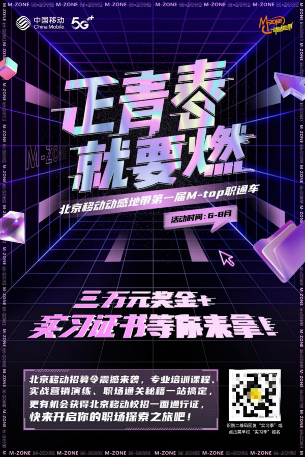 报名活动从6月1日持续到6月17日,感兴趣的小伙伴可以关注北京移动动感地带微信公众号,点击菜单栏中“实习季”或回复“实习季”报名;或者关注北京移动微信公众号,回复“动感地带实习季”报名。