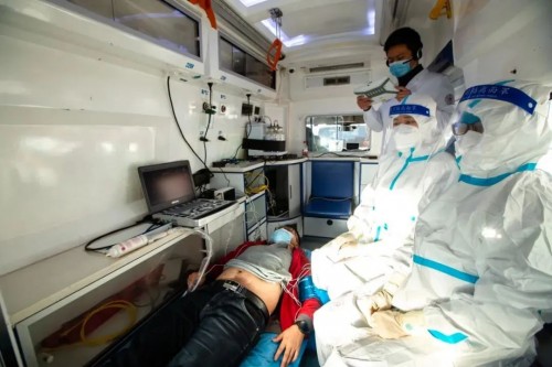 在北医三院崇礼院区的急救车内,迈瑞高端便携彩超M9和BeneVision N1转运监护仪正在获取患者的超声图像及生命体征数据。