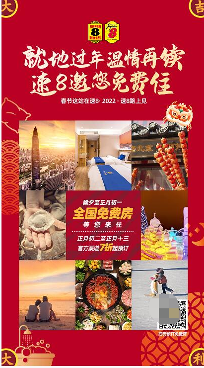 活动时间为2022年1月31日— 2022年2月1日(农历除夕-正月初一),预订方式:1月27日起,通过速8酒店官方App进入活动页面注册并申请,审核通过后即可参与活动,每一位用户预订一间客房仅可入住1晚。