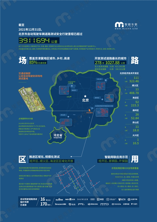 正如报告中显示,截至2021年底,共有16家测试主体的170辆车在此参与自动驾驶车辆通用技术测试。道路测试安全行驶里程累计已超过 3911694公里,连续3年保持增长,超过全国测试总里程的一半份额。此外,北京市自动驾驶测试车辆牌照数、测试类型、开放测试道路里程数均处于全国领先地位。