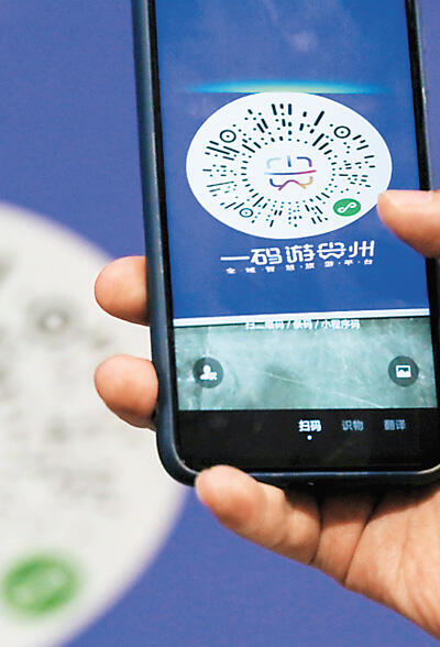 游客在扫描“一码游贵州”全域智慧旅游平台的二维码。