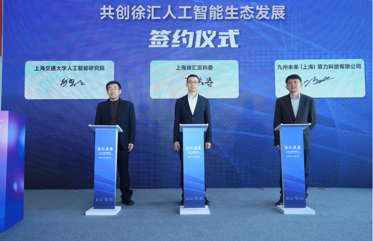 今年来,以大语言模型为代表的人工智能技术在全球掀起科技和产业创新浪潮,人工智能应用在大模型领域打开新局面。徐汇作为上海市首个人工智能产业集聚区,创新要素活跃、产业基础扎实、区位优势明显;上海交通大学在人工智能领域具有雄厚基础,并长期与徐汇区保持紧密友好合作;九州未来将在徐汇西岸落成智算中心,为徐汇大模型企业赋能及服务。会上,由上海市徐汇区科委副主任郭岩涛、上海交通大学人工智能研究院院长助理何黎明、九州未来董事长张淳共同发起“共创徐汇人工智能生态发展”签约,围绕大模型技术创新和应用落地展开深度合作,引领上海大模型产业发展。