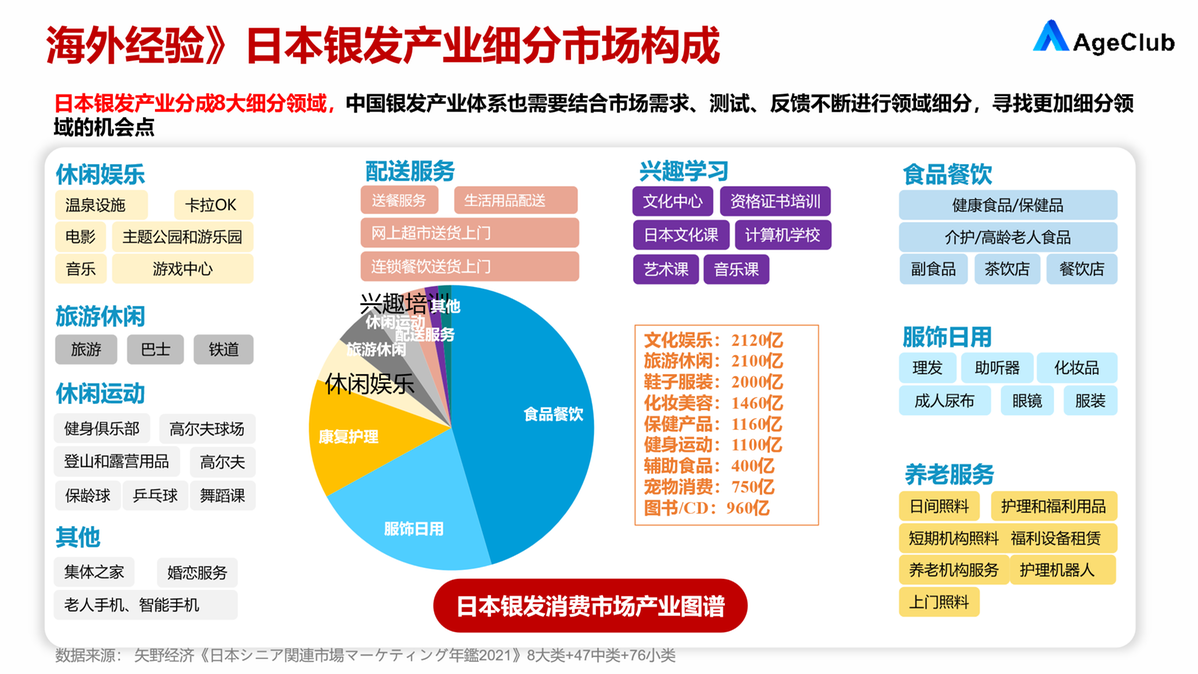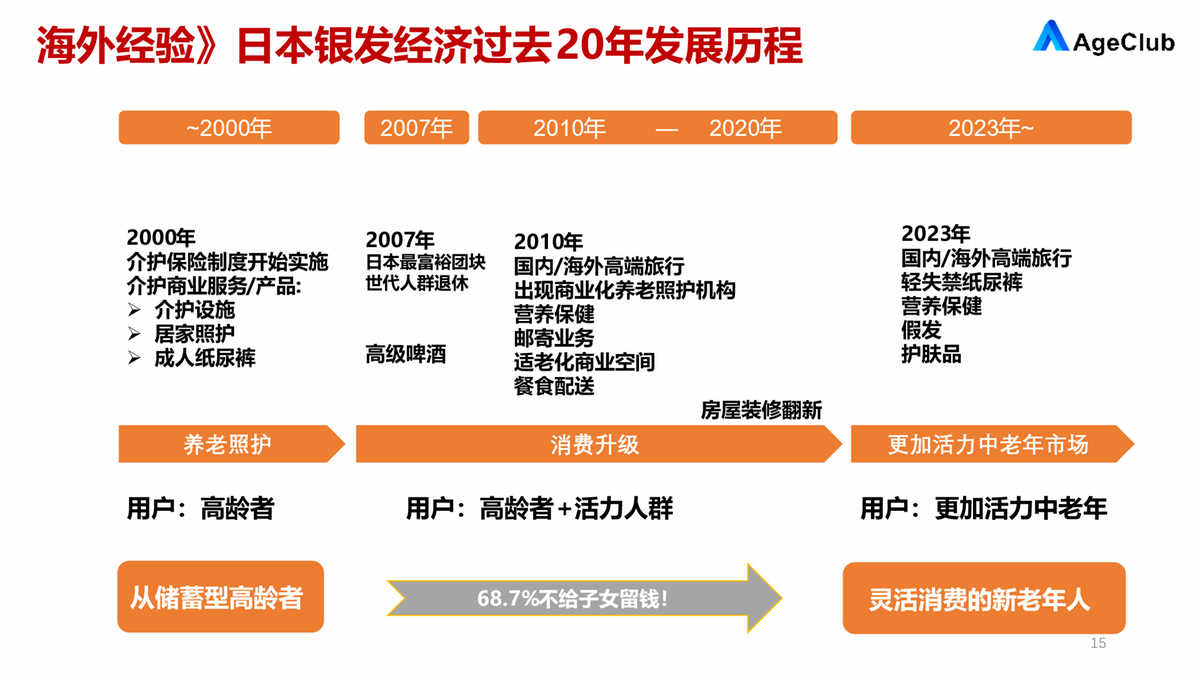 回顾日本银发市场的发展历程,我们可以发现其消费人群,日本老人从原来的储蓄型转变成了灵活消费的新老年人。换言之,日本的发展逻辑是从刚需人群到活力人群,再到更具活力的未老人群。如今日本有68.7%老年人不给子女留一分钱,这也是日本政府为刺激银发消费进行长期宣传的价值观念——大家要为自己而活。