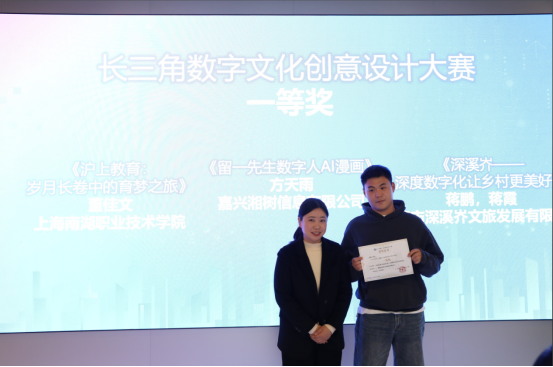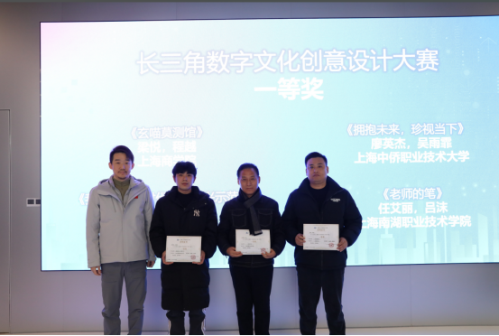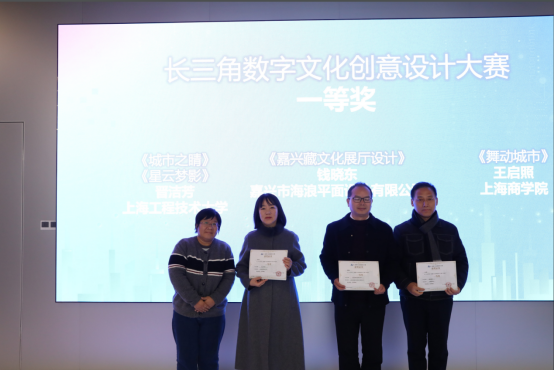 会上,普陀区总工会骆艳部长,波克科技刘忠生书记,长三角数字文创服务中心金弘雨主任,上海人工智能研究院皇甫秉京主任,元宇宙数字体验馆王哲馆长,中侨大学刘群书记,上海工商外国语王宇翔院长等领导还为2024年长三角数字文化创意设计大赛一等奖获奖选手颁发了证书。