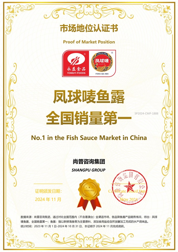 近日,国内权威调研机构尚普咨询集团正式发布认证:凤球唛鱼露凭借卓越的市场表现与消费者口碑,荣获“全国销量第一”的市场地位认证!这一荣誉不仅彰显了凤球唛在鱼露品类中的领先地位,更印证了东莞市永益食品有限公司其多年匠心品质的深厚积淀。