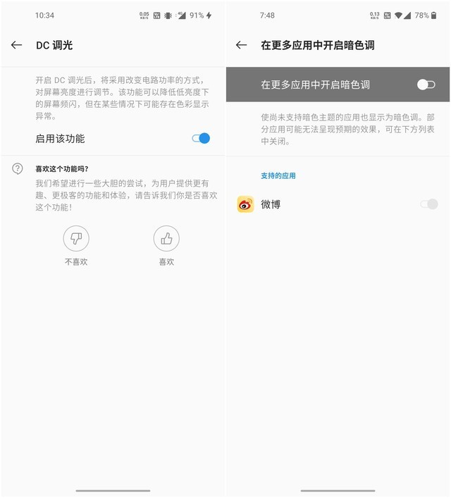 同时,一加的深度定制化无疑加深了用户对于系统的好感度。你可以任意调节状态栏、启动桌面以及AOD特效,甚至在一加实验中,DC调光和暗色调都支持用户的自行调节。无广告的系统生态和禅定模式同时是一加在系统层面做“减法”的体现。