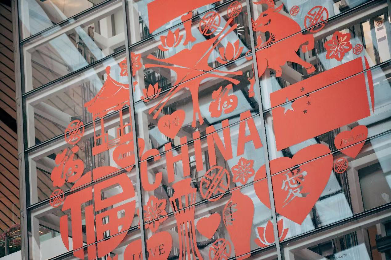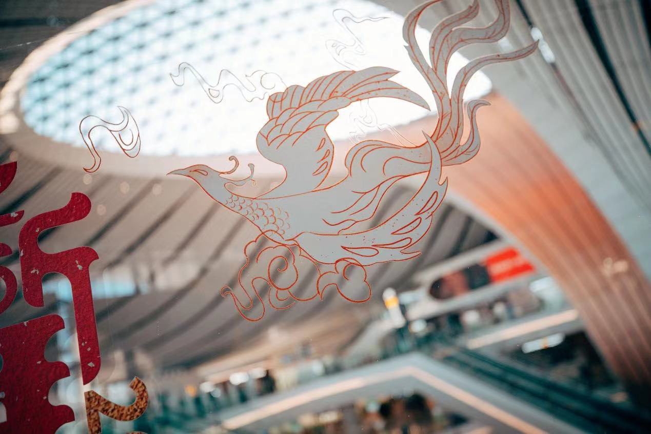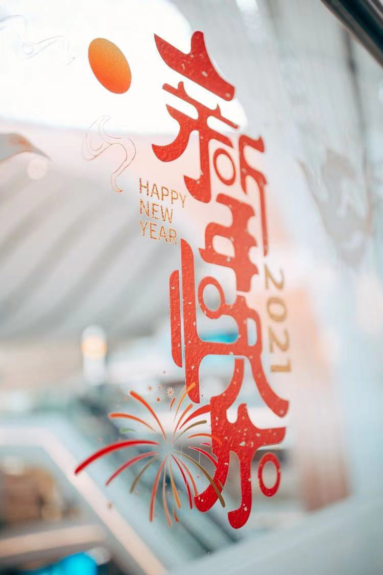 此次大兴国际机场在直梯玻璃上贴上了巨幅的灯笼贴画,“CHINA”、国旗、福字、年夜饭等等,多种元素汇集在一起,喜庆祥和中传递出中国年的理念,愿牛年顺遂、“牛”转乾坤!