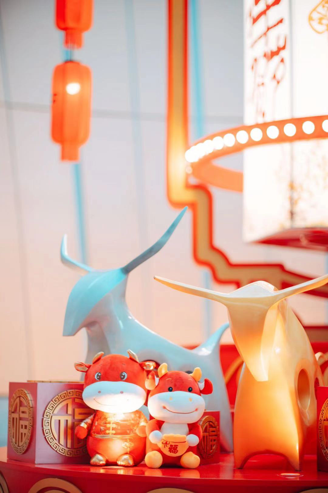 灯箱下,可爱的卡通生肖形象玩偶牛,很富亲和力,给人们带来轻松愉悦的感受。