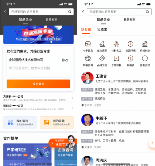 企业可以在“企业页面”一健快速发布产学研的合作需求,也可以在专家库中按照自己企业的需求方向挑选想要合作的专家,查看专家的过往经历和擅长方向、学术应用领域等重要信息。