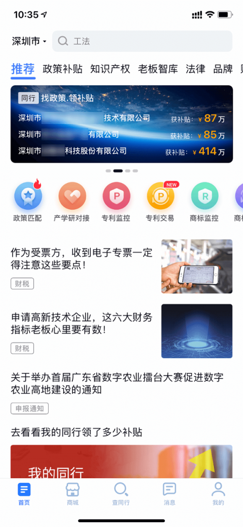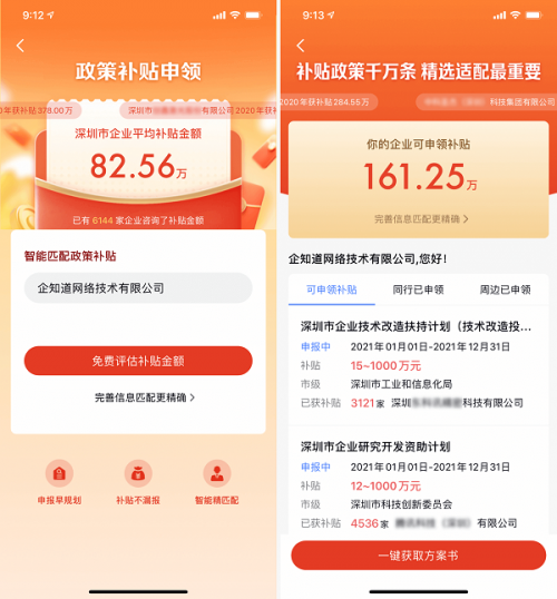 这是新版本最给力的功能,政策补贴项目一键查询,快速匹配可申领项目。用户注册登录后,输入企业名称,一键智能智能匹配自己公司可申请的政策补贴,补贴金额根据大数据精准计算得出,同时展示“可申领补贴”、“同行已申领”、“周边已申报”3块列表,同时也可以一键获取方案书,免费咨询评估,为企业节省申报时间。