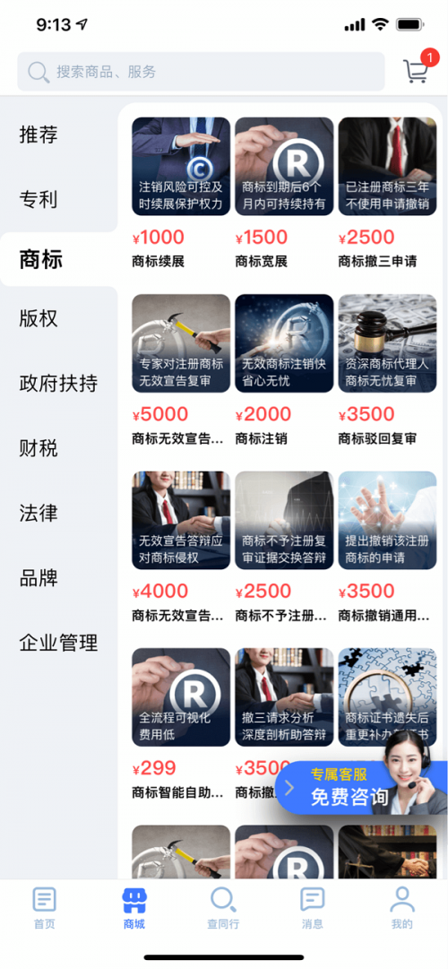 商城项目分为1个智能推荐和8个品类:商标、专利、版权、政策补贴、财税、法律、品牌、企业管理,方便企业快速找到适合自己的服务项目。
