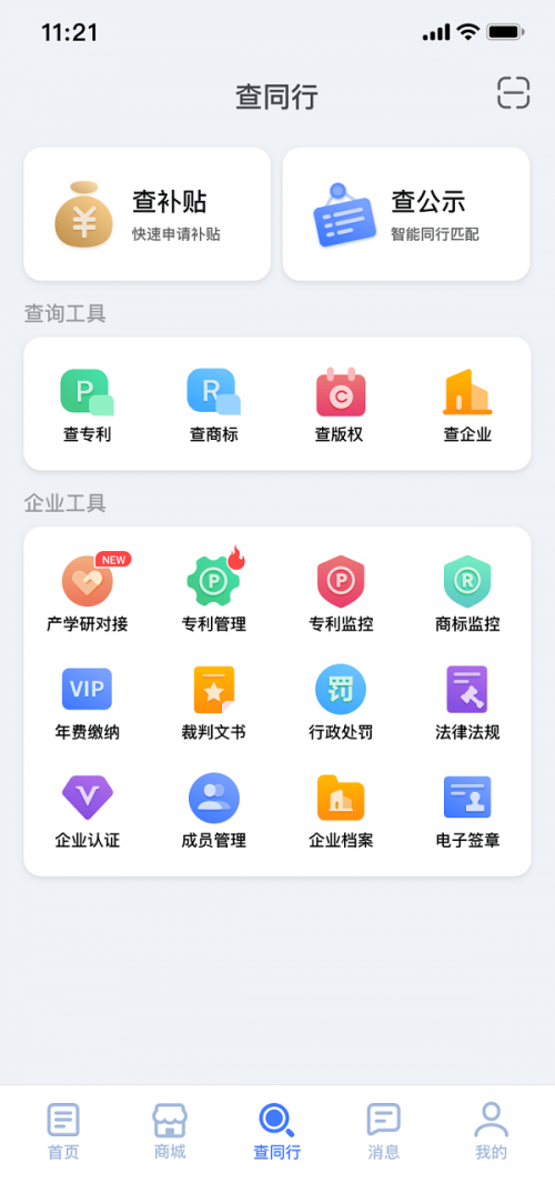 新版本“查同行”对原版本中的多个实用小工具进行了重新分类整合。和补贴申领相关的“查补贴”和“查公示”被放置到顶端。其它四大类常用查询工具:查专利、查商标、查版权、查企业依次排列在第二行。企业工具更多更全,覆盖企业的方方面面,是企业管理的好助手。