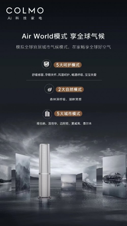 空气安静流淌于一呼一吸之间,虽不张扬,却是健康生活的必需要素。当对品质的极致追求逐渐成为健康人居的标配,人们对空气的要求也远远不止于冷暖而已。COLMO空调突破传统思维,将空调不再定义为调节温度的季节性家电,而是引领消费者更加亲近自然的“护航者”,以对家居微气候的精细化管理,让用户在室内也能畅想宛如山海之间的清新舒爽空气,一年四季都能感受到源于自然的细腻生活体验。
