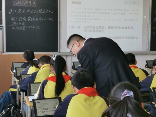 段元凯老师为六年级学生带来数学课《比例尺的意义》。段老师早在课前就发布了预习任务,根据学生提交作业情况,提前了解学情。课上,段老师展示学生作业,引导学生进入比例尺的学习。借助互动讨论功能,方便学生透彻了解比例尺的意义。课堂练习环节,通过拍照讲解功能,对不同的作业进行对比讲评,提高了学生对比例尺的理解和认识;全班作答功能的使用,帮助教师全面了解学生的作答情况,提高练习讲解的针对性和有效性;学生讲的配合应用,则进一步提高了学生的表达能力和对题目的掌握水平。