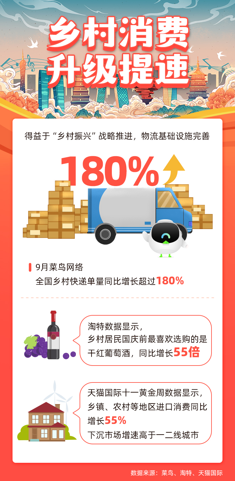 乡村消费升级提速:菜鸟乡村快递单量同比增长180%