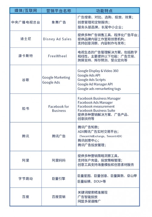 因此媒体把各种广告和营销资源聚合在平台化的产品上,通过数字化、智能化的服务提升营销传播能力成为一种趋势。我们通过梳理发现,海外和国内的巨型的媒体集团和互联网媒体机构也都有布局自己的数字营销平台。