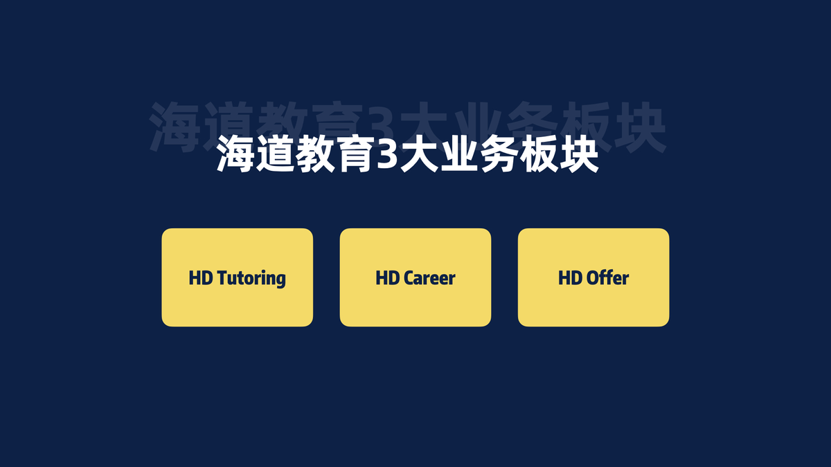 海道教育聚焦于留学生群体的多种痛点,很多学者将现在称之为“后精英教育时代”,认为中国现代社会的高等教育已经全面步入后精英时代,并且处于转型升级的拐点之上。但国外大众教育和精英教育的分离模式却一直是延续的,基于此,中国留学生不仅要面对语言差异带来的文化鸿沟,同时还要面临国外教育产生的分离模式在学业上带来的巨大压力,如留学彷徨、群体低龄化所造成的孤独感、中西方文化的冲击以及学业体系差异所带来的听不懂、看不懂、考点学不懂等问题,确定了三大主要的学业辅导业务板块,同时围绕留学生的多阶段需求进行产品布局,打造出符合留学生全生命周期的三大业务模块:课业同步辅导(HD Tutoring)、职场规划(HD Career)、申研考学(HD Offer)。