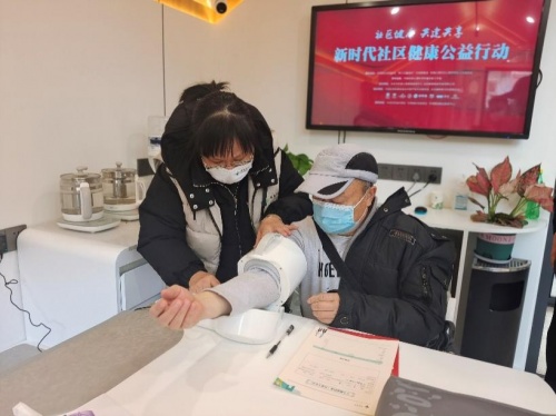 工作人员为社区居民量血压