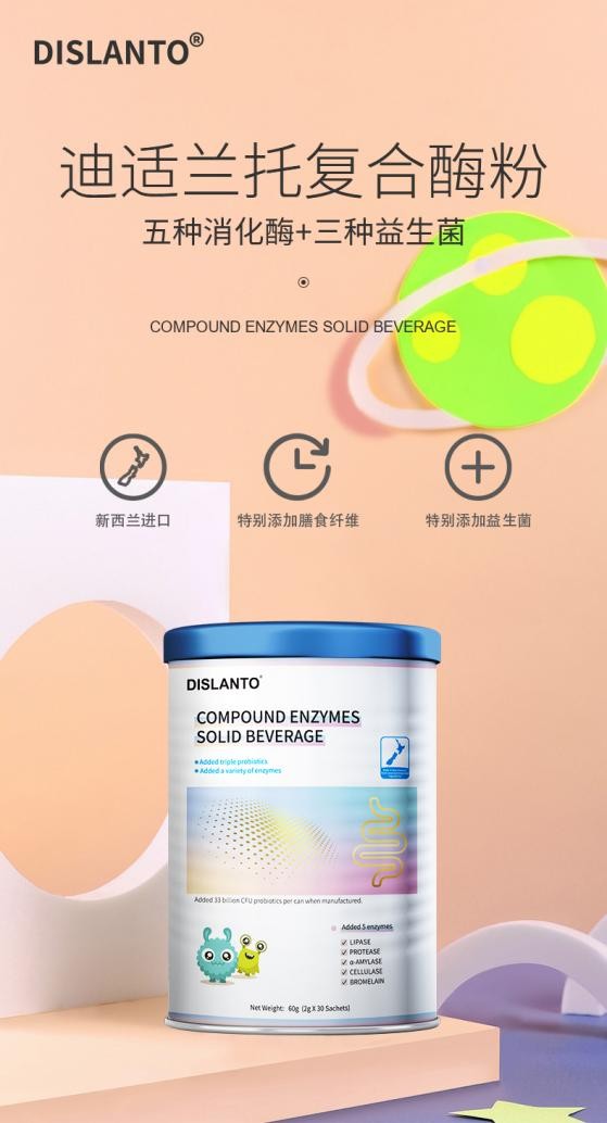 在配方上,迪适兰托消化酶采用了消化酶+益生菌+益生元的独特组合,消化酶负责分解食物中的营养物质,促进营养的消化与吸收;与此同时,益生菌作为辅助,可以调节肠道菌群平衡,帮助修复受损肠道;而益生元的加入,不仅可以有利于益生菌的增殖,还可以缓解由消化不良引起的便秘及腹泻问题,多管齐下,快速改善消化不良症状,温和守护人们的肠道健康。