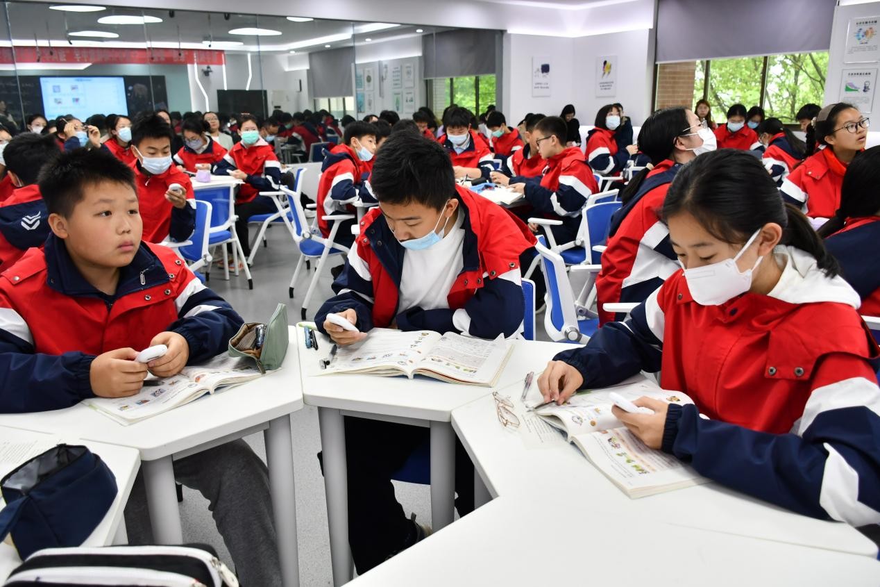 课上,教师与学生通过使用互动平板等智能化装备,体验智能技术带来的课堂变革。