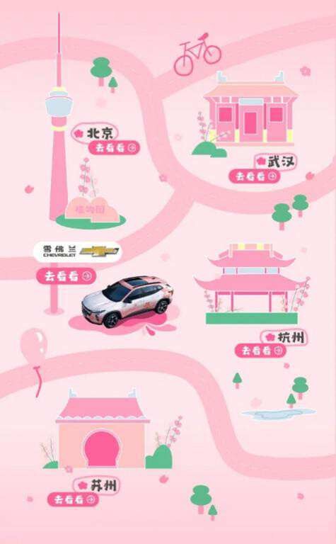 除上海之外,还有不少城市的雪佛兰4S店正化身为小红薯打卡圣地。在小红书站内搜索#一整个粉住你,在话题h5的樱花地图里找到雪佛兰,点击进入品牌活动页面就可以找到具体活动城市。带话题#一整个粉住你 发布和雪佛兰星迈罗樱花限量版的合照,就有机会get趣味雪佛兰樱花徽章。