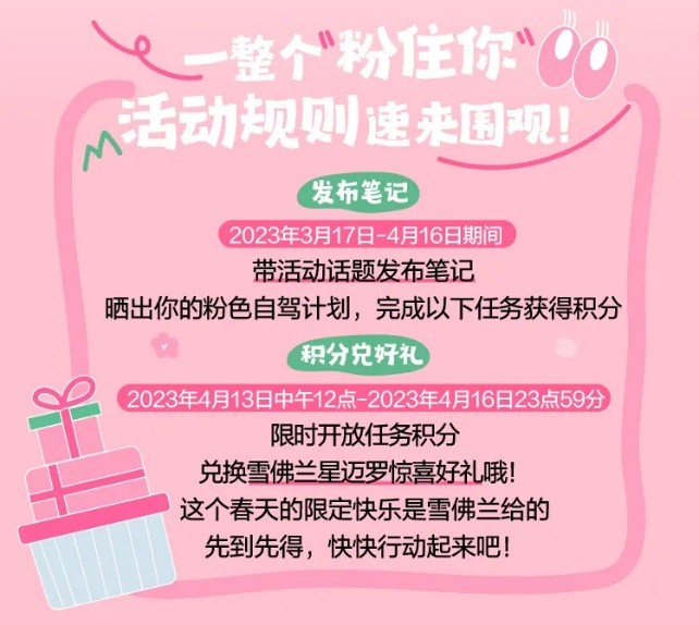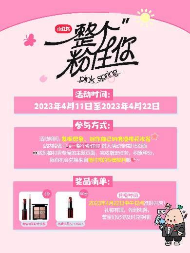 除此之外,上小红书搜#一整个粉住你 ,进入活动H5还有更多线上玩法。不仅有粉色少女心测试可玩,还能参与积分任务,换取雪佛兰樱花焕色睛雨伞、雪佛兰落樱缤纷保温杯、M豆花生牛奶巧克力、汤达人樱花杯、一整个粉住你大礼盒等等丰厚奖品。