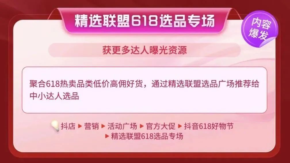 「精选联盟618选品专场」集合618热卖品类低价高佣好货,撮合商达建联,为商家提供更多达人曝光资源。