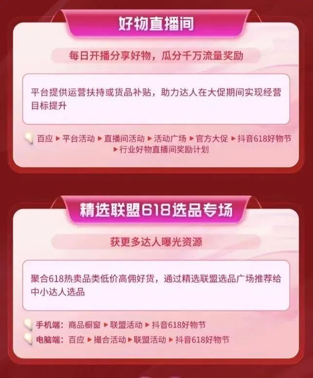 对于达人来说,直播与选品是驱动事业增长的两大引擎。尤其是近年来,直播间成为618、双11等购物狂欢新战场,对于达人带货也提出了更高要求。抖音618好物节也为达人提供了相应的扶持,携手创作者共赴滚烫新事业。其中,「好物直播间」将为达人提供运营扶持、货品补贴,在大促期间帮助达人实现高效种草;「精选联盟618选品专场」则通过精选联盟选品广场多重资源位,为达人提供丰富的货品供应选择。