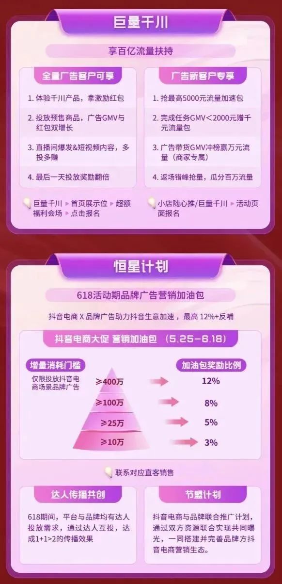 抖音618好物节期间,「巨量千川」拿出了百亿流量资源扶持,协助商家探索“多投多赚”的投放链路。而「恒星计划」则携手品牌广告推出最高12%+反哺;商家不仅可以获得大促营销加油包,还能在达人传播共创、节盟计划等推广活动中,实现完善的营销生态共创。