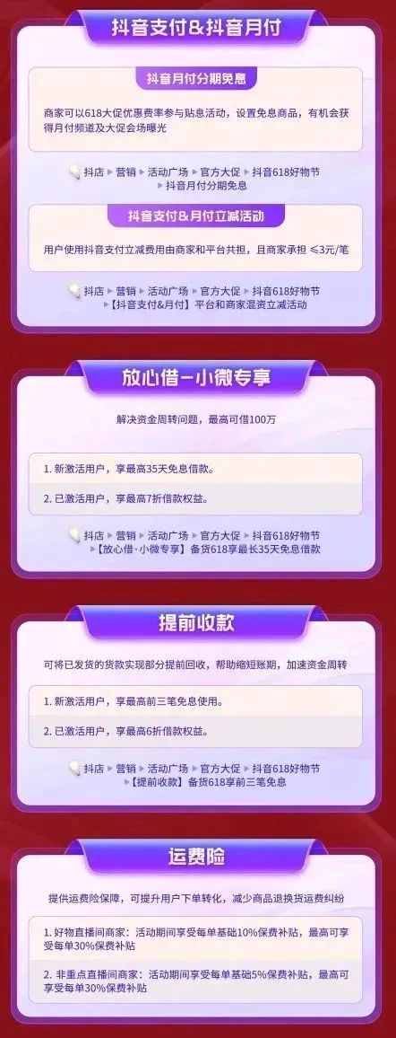 在财经玩法方面,「抖音支付&抖音月付」以免息产品、支付立减方式,「运费险」以保费补贴方式,加快用户下单决策;而「放心借-小微专享」与「提前收款」,可有效缓解商家资金周转困难的难题,加快大促期间资金流转。