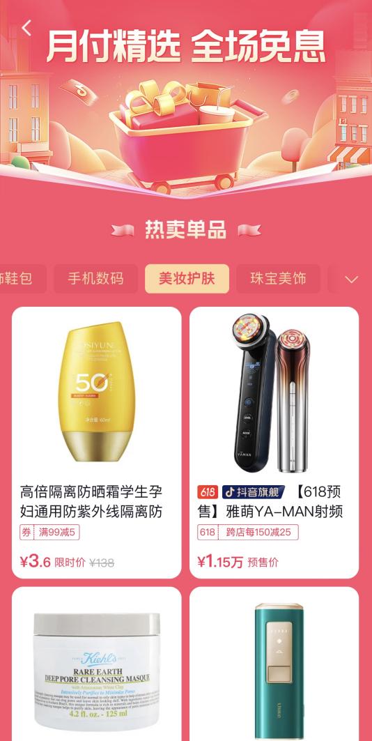618马上到了,各大平台和品牌产品的优惠方案、定金链接也陆续上线,不少消费者也在“摩拳擦掌”为这次618做准备,只为花更少的钱,买到更多好物。抖音商城作为当下越来越受欢迎的线上购物平台,自然也为消费者准备了福利与惊喜。在今年的抖音月付好物节免息会场,就有无数大牌尖货在等待着消费者!