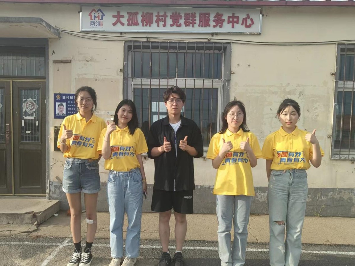 图为调研队成员在大孤柳村党群服务中心前合影 齐雅茹摄