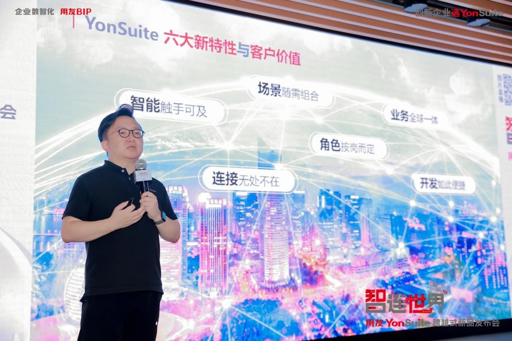 在活动现场,张磊为与会嘉宾进一步展示了YonSuite六大新特性与客户价值,新版YonSuite积极拥抱AI浪潮,通过打造更智能化的场景应用,更精细化的管控和更具人性化的用户体验,让智能触手可及,场景随需组合,业务全球一体,角色按岗而定,开发如此便捷,连接无处不在,全新升级的YonSuite成长型企业商业创新平台将以更灵活、更全面、更智能的形象呈现给广大创新企业。