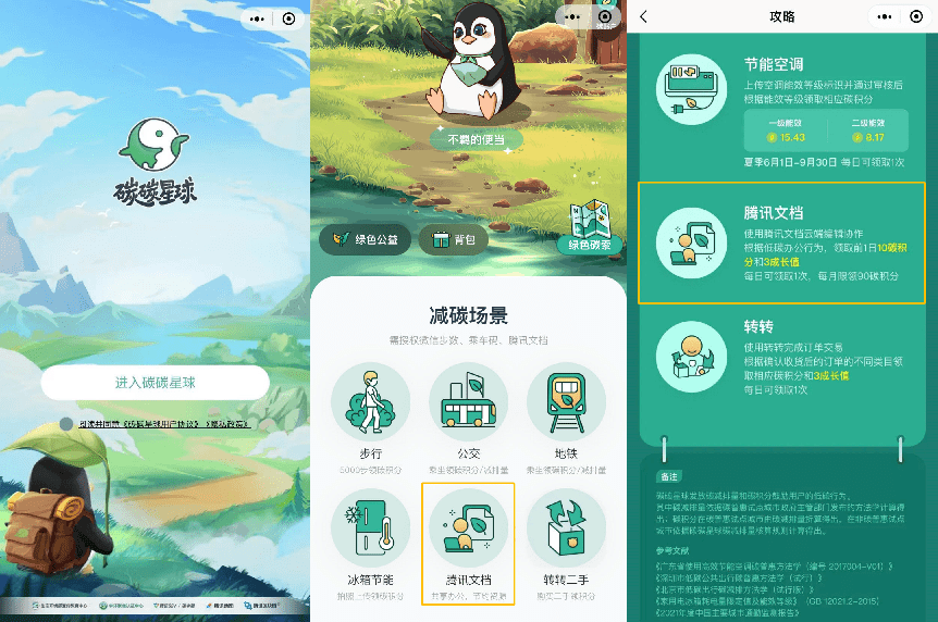 碳碳星球是腾讯SSV碳中和实验室打造的一款面向全民的低碳数字生活方式平台,旨在通过接入与公众生活息息相关的碳减排场景,按照减碳量和碳积分两套模式鼓励用户的减碳行为。即日起,用户打开碳碳星球,点击腾讯文档授权登录,根据前1日使用腾讯文档低碳办公的行为,每日可领取对应的10碳积分奖励。获得的碳积分除了可以在积分商城兑换奖励,或捐赠给碳中和相关的公益项目,还能为你的虚拟宠物小企鹅实现“碳的供养”,享受“低碳养鹅”的快乐。