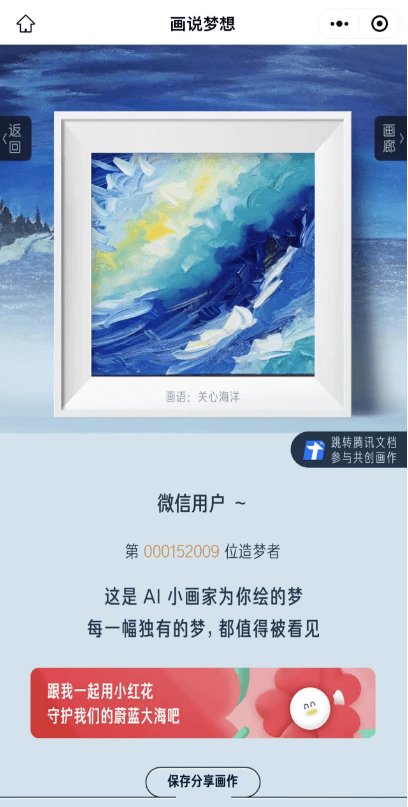 用户在微信进入“画说梦想”小程序,可以向大海许愿,并获得专属每个人的梦想画作。完成画作后,用户可以进入腾讯文档参与共创画作,一同 “共创蔚蓝大海”——为像素画填色,还海一片蓝。该画作在共创完成后将参与腾讯公益99公益日活动,前往活动平台为共创画作送花,即可支持海洋保护相关公益项目,连接“低碳”与“公益”场景,用数字化助力生态可持续。