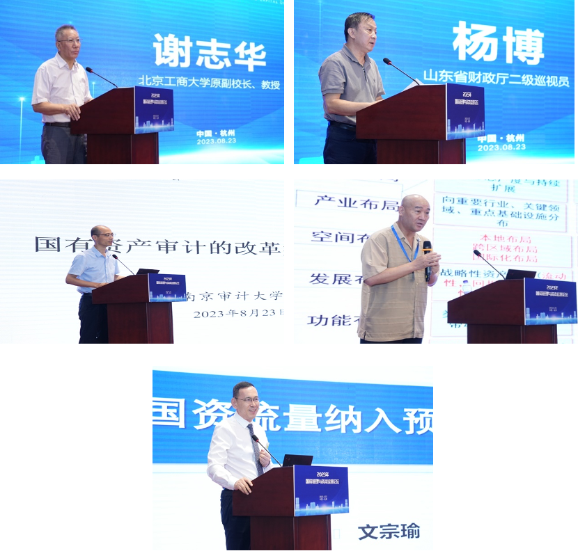 北京工商大学原副校长谢志华教授、山东省财政厅二级巡视员杨博、南京审计大学副校长陈骏教授、华彩咨询白万纲董事和中国财政科学研究院文宗瑜研究员分别从国有资产治理和管理、国有资产财会监督、国有资产审计监督、国有资本授权经营改革和国资流量补充政府预算等方面做了主题发言。