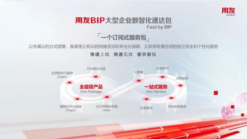 用友BIP大型企业数智化速达包Fast by BIP,是用友面向大型企业全新推出的全套数智化服务包,包括One Package全级次产品 和One service一站式服务整体。全级次产品包含应用软件与服务(SaaS)、数智化平台底座(PaaS)、行业领先实践、云计算基础设施(IaaS),满足大型企业数据服务、智能化、社会化连接、协同工作与应用融合的需求。一站式服务包含云部署、实施客开、迁移服务、异构系统集成、运营服务,以实现客户商业价值、落地特定业务结果为目标,从应用到运营、从技术到开发、从部署到集成、从数据到迁移,实现一站式打包服务。