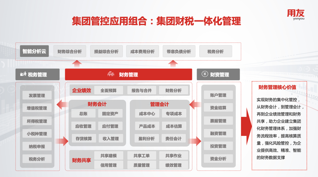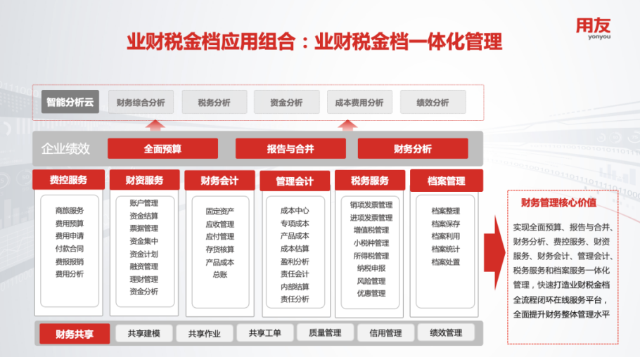 业财税金档应用组合实现全面预算、报告与合并、财务分析、费控服务、财资服务、财务会计、责任会计、税务服务和档案服务一体化管理,快速打造业财税金档全流程闭环在线服务平台,全面提升财务整体管理水平。
