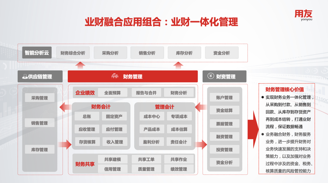 业财融合应用组合实现财务业务一体化管理,从采购到付款、从销售到回款、从库存到存货资产再到成本结转,打通业财流程,保证数据畅通。业务融合财务,财务服务业务,进一步提升财务对业务快速发展的支持和决策能力,以及加强对业务过程中涉及的资金、税务、核算质量的风险管控能力。