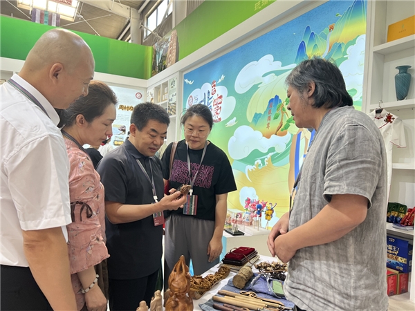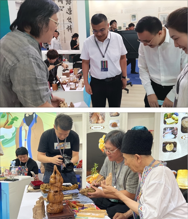 在现场展示体验区,褚德胜与鲁派内画、泰山石家面塑、威海锡镶、刘氏盘扣、拓片制作技艺等山东特色非遗项目传承人的精湛技艺,获得了与会领导同志的高度评价及观众的一致认可。