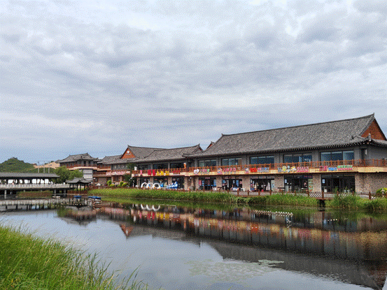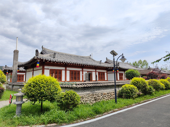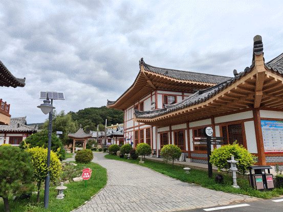 青瓦白墙、飞檐翘角,加上灰色的院墙、木色的门窗,极力还原了朝鲜族民宅的原汁原味。 中国日报网 杨晓恒摄