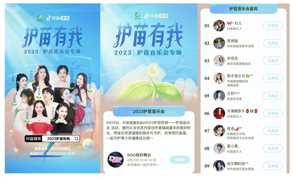 近年来,音乐越来越多地用于儿童和青少年的心理疗愈。为了呼吁更多人参与到青少年保护的工作中,8月29日晚,“护苗音乐会”在抖音官方账号@DOU有好舞台 开启。音乐会邀请了@高瑞璇、@李百灵、@歌手易文卉、@王莉、@程语、@梁文静的梁、@许海霞歌手、@夏小夏、@玖儿 9位来自中央歌剧院、中国歌剧舞剧院、中央民族乐团等专业院团的专业主播以及抖音音乐人参与,吸引了超600万人次在线观看。