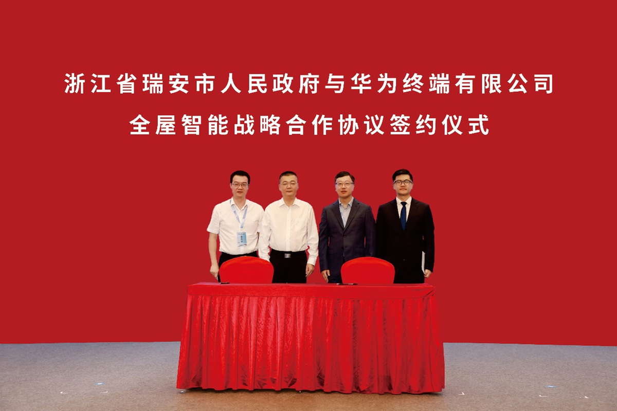 2023年9月6日,瑞安市人民政府与华为终端有限公司在2023年瑞安城市高质量发展论坛上签约全屋智能战略合作协议。瑞安市委常委林朝进,华为终端浙江省总经理蓝荣代表双方签字。瑞安市市委副书记、市长秦肖,华为终端BG首席战略官、全屋智能产品线总裁邵洋见证签约。双方将协同瑞安本地企业,充分发挥各自优势,探索在住房、教育、医疗等领域公共配套设施中,实现低碳、节能的建筑智慧化、生态化、全屋化的数字空间技术运用,提升生活空间配套设施的建设品质。同时,围绕鸿蒙开源系统和全屋智能,共同探索推动建立健全数字化建筑产业评价体系和标准,响应国家双碳政策,高起点打造数字家庭、智慧建筑生态体系,共同促进瑞安本地建筑及智能家居产业集群培育。