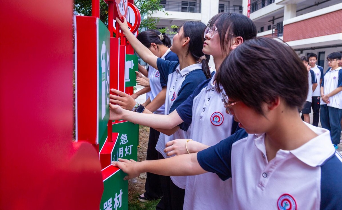 仅仅是主题教室还不够,消防主题广场同样也吸纳了一批“消防粉丝”,小粉丝们聚集在消防翻板前热闹的讨论着对应的安全知识。此外,“主角”灭火器也受到了师生的欢迎,消防宣传员对灭火器辨别、操作使用进行简单介绍后,师生踊跃参与,积极开展灭火实操演练,体会“提、拔、握、压”口诀的具体操作过程。
