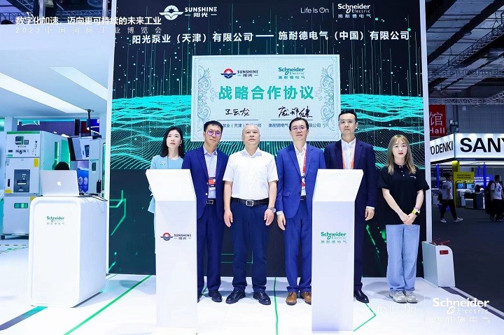 今天,在2023年第23届中国国际工业博览会现场,全球能源管理和自动化领域的数字化转型专家施耐德电气,与阳光泵业(天津)有限公司(以下简称“阳光泵业”)达成战略合作。凭借在数字化转型、软硬件产品、绿色低碳等方面的能力优势和实践经验,施耐德电气将助力阳光泵业推动数字化转型及先进智能工厂建设,进一步提高生产效率与质量,优化节能减排及运营管理能力,引领我国装备制造业走向绿色、智能、先进。施耐德电气高级副总裁工业自动化业务中国区负责人庞邢健、阳光泵业总经理王云龙,代表双方签订合作协议。