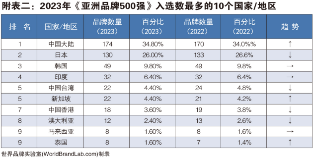 《亚洲品牌500强》的评判标准是品牌的亚洲影响力。世界品牌实验室学术委员会主席、牛津大学教授斯蒂芬·沃格(Prof. Steve Woolgar)分析,评价亚洲品牌影响力的基本指标包括市场占有率(Market Share)、品牌忠诚度(Brand Loyalty)和亚洲领导力(Asian Leadership)。此次亚洲品牌500强共有20个国家和地区的品牌入选,中国(包含港澳台)入选的品牌共计215个,占整个亚洲品牌500强的43.00%,位居第一,其中中国大陆入榜品牌有174个;日本有130个品牌入选,位居第二;位居第三的是韩国,入选49个品牌。沃格教授认为,亚洲拥有40多亿人口,占世界人口的60%,仍然是世界上最具潜力的经济体。在亚洲市场内,外国品牌投资中国比投资印度能获得更多的回报,因为中国有强大的基础设施和庞大的中产阶层,这是印度没有的优势。[见附表二]
