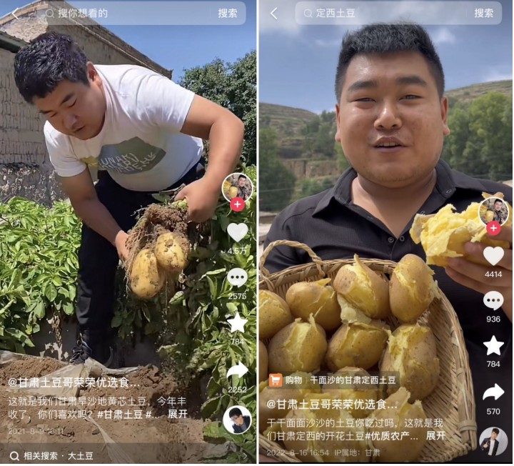 作为甘肃的特色农产品,马铃薯是抖音电商“山货上头条丰收季”重点扶助的农特产。在2023年中国农民丰收节到来之际,抖音电商投入了千万级农产品货品补贴及流量资源,覆盖百余村镇,助力地方农货上行。数据显示,今年1月至8月,抖音电商里甘肃马铃薯销量同比增长175%,甘肃省内马铃薯农货商家在抖音电商入驻经营的数量也同比提升了85%。